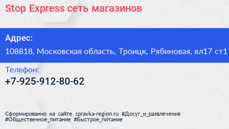 [Stop] Express, сеть магазинов по адресу 108818, Московская область, Троицк, Рябиновая, вл17 ст1 в дальнейшем Организация, размещена в следующих категориях: