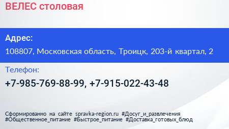 ВЕЛЕС, столовая по адресу 108807, Московская область, Троицк, 203-й квартал, 2 в дальнейшем Организация, размещена в следующих категориях: