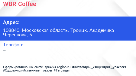 WBR Coffee по адресу 108840, Московская область, Троицк, Академика Черенкова, 5 в дальнейшем Организация, размещена в следующих категориях: