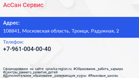 АсСан Сервис по адресу 108841, Московская область, Троицк, Радужная, 2 в дальнейшем Организация, размещена в следующих категориях: