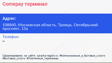 Comepay, терминал по адресу 108840, Московская область, Троицк, Октябрьский проспект, 15а в дальнейшем Организация, размещена в следующих категориях: