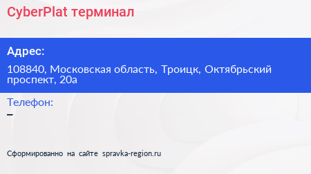 CyberPlat, терминал по адресу 108840, Московская область, Троицк, Октябрьский проспект, 20а в дальнейшем Организация, размещена в следующих категориях: