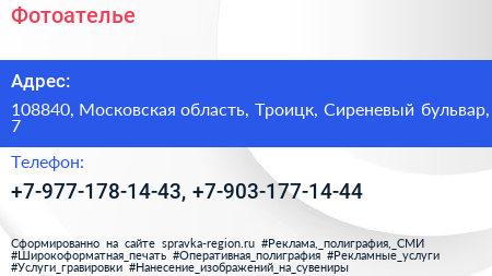 Фотоателье по адресу 108840, Московская область, Троицк, Сиреневый бульвар, 7 в дальнейшем Организация, размещена в следующих категориях: