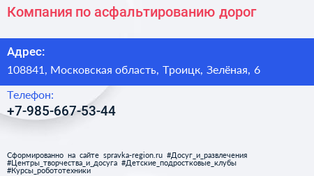 Компания по асфальтированию дорог по адресу 108841, Московская область, Троицк, Зелёная, 6 в дальнейшем Организация, размещена в следующих категориях:
