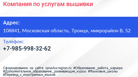 Компания по услугам вышивки по адресу 108841, Московская область, Троицк, микрорайон В, 52 в дальнейшем Организация, размещена в следующих категориях:
