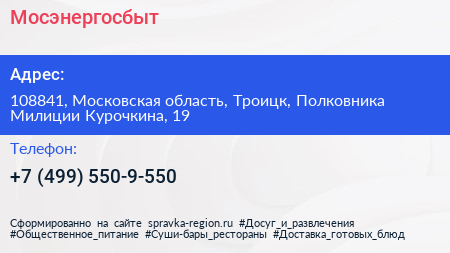 Мосэнергосбыт по адресу 108841, Московская область, Троицк, Полковника Милиции Курочкина, 19 в дальнейшем Организация, размещена в следующих категориях: