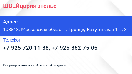 ШВЕЙцария, ателье по адресу 108818, Московская область, Троицк, Ватутинская 1-я, 3 в дальнейшем Организация, размещена в следующих категориях: