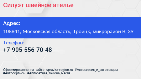 Силуэт, швейное ателье по адресу 108841, Московская область, Троицк, микрорайон В, 39 в дальнейшем Организация, размещена в следующих категориях: