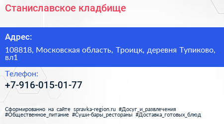 Станиславское кладбище по адресу 108818, Московская область, Троицк, деревня Тупиково, вл1 в дальнейшем Организация, размещена в следующих категориях: