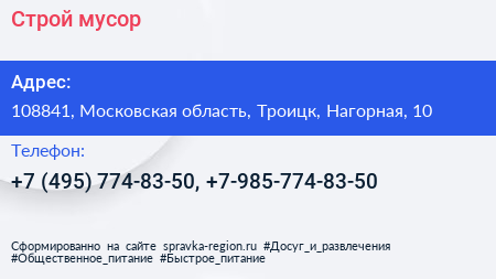 Строй-мусор по адресу 108841, Московская область, Троицк, Нагорная, 10 в дальнейшем Организация, размещена в следующих категориях: