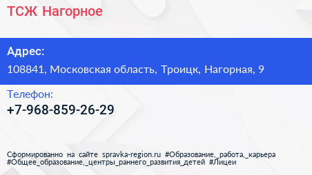 ТСЖ Нагорное по адресу 108841, Московская область, Троицк, Нагорная, 9 в дальнейшем Организация, размещена в следующих категориях: