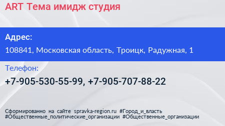 ART Тема, имидж-студия по адресу 108841, Московская область, Троицк, Радужная, 1 в дальнейшем Организация, размещена в следующих категориях: