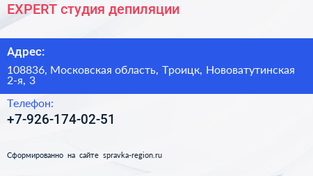 EXPERT, студия депиляции по адресу 108836, Московская область, Троицк, Нововатутинская 2-я, 3 в дальнейшем Организация, размещена в следующих категориях: