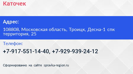 Каточек по адресу 108808, Московская область, Троицк, Десна-1 спк территория, 25 в дальнейшем Организация, размещена в следующих категориях: