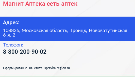 Магнит Аптека, сеть аптек по адресу 108836, Московская область, Троицк, Нововатутинская 6-я, 2 в дальнейшем Организация, размещена в следующих категориях: