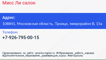 Мисс Ли, салон по адресу 108841, Московская область, Троицк, микрорайон В, 15а в дальнейшем Организация, размещена в следующих категориях: