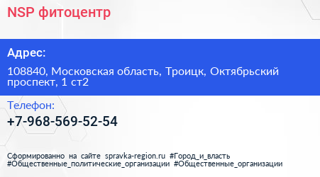 NSP, фитоцентр по адресу 108840, Московская область, Троицк, Октябрьский проспект, 1 ст2 в дальнейшем Организация, размещена в следующих категориях: