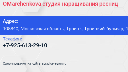 OMarchenkova, студия наращивания ресниц по адресу 108840, Московская область, Троицк, Троицкий бульвар, 1 в дальнейшем Организация, размещена в следующих категориях: