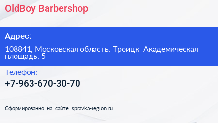 OldBoy Barbershop по адресу 108841, Московская область, Троицк, Академическая площадь, 5 в дальнейшем Организация, размещена в следующих категориях: