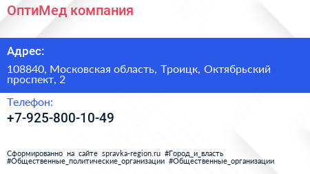 ОптиМед, компания по адресу 108840, Московская область, Троицк, Октябрьский проспект, 2 в дальнейшем Организация, размещена в следующих категориях: