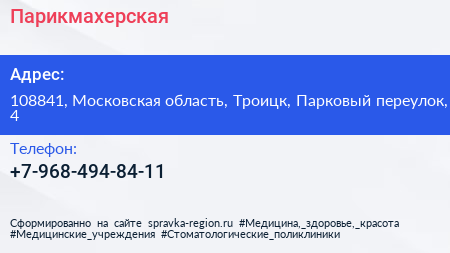 Парикмахерская по адресу 108841, Московская область, Троицк, Парковый переулок, 4 в дальнейшем Организация, размещена в следующих категориях: