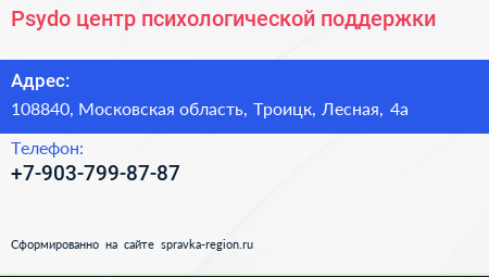 Psydo, центр психологической поддержки по адресу 108840, Московская область, Троицк, Лесная, 4а в дальнейшем Организация, размещена в следующих категориях: