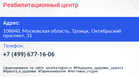 Реабилитационный центр по адресу 108840, Московская область, Троицк, Октябрьский проспект, 31 в дальнейшем Организация, размещена в следующих категориях: