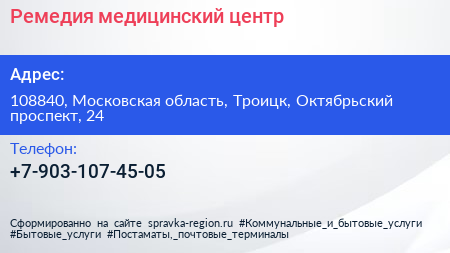 Ремедия, медицинский центр по адресу 108840, Московская область, Троицк, Октябрьский проспект, 24 в дальнейшем Организация, размещена в следующих категориях: