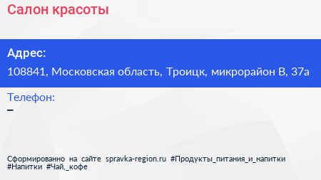 Салон красоты по адресу 108841, Московская область, Троицк, микрорайон В, 37а в дальнейшем Организация, размещена в следующих категориях:
