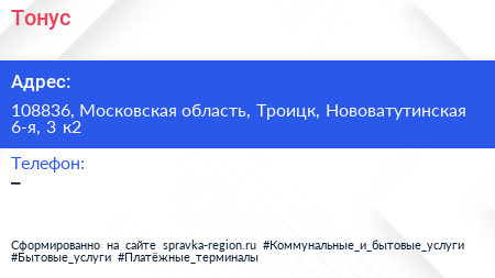 Тонус по адресу 108836, Московская область, Троицк, Нововатутинская 6-я, 3 к2 в дальнейшем Организация, размещена в следующих категориях: