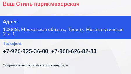 Ваш Стиль, парикмахерская по адресу 108836, Московская область, Троицк, Нововатутинская 2-я, 1 в дальнейшем Организация, размещена в следующих категориях:
