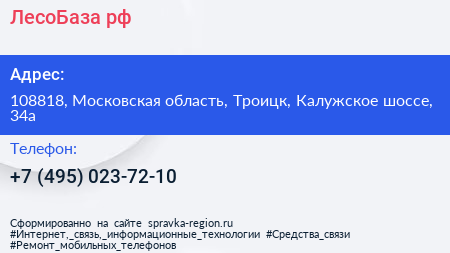 ЛесоБаза.рф по адресу 108818, Московская область, Троицк, Калужское шоссе, 34а в дальнейшем Организация, размещена в следующих категориях: