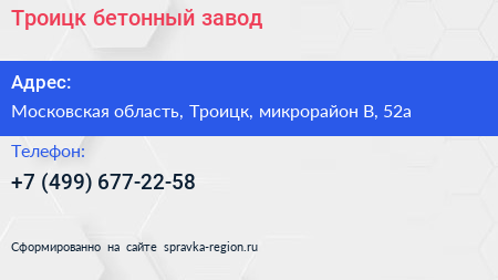Троицк, бетонный завод по адресу Московская область, Троицк, микрорайон В, 52а в дальнейшем Организация, размещена в следующих категориях: