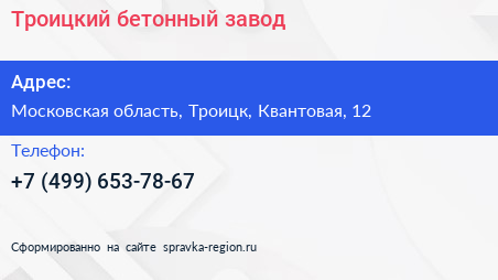 Троицкий бетонный завод по адресу Московская область, Троицк, Квантовая, 12 в дальнейшем Организация, размещена в следующих категориях: