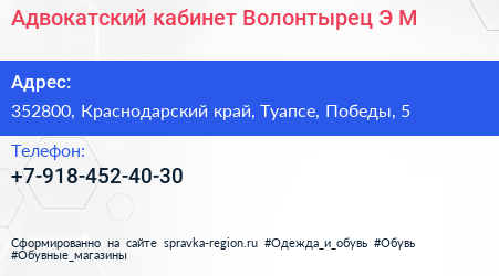 Адвокатский кабинет Волонтырец Э.М. по адресу 352800, Краснодарский край, Туапсе, Победы, 5 в дальнейшем Организация, размещена в следующих категориях: