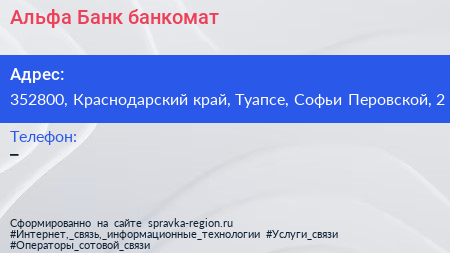 Альфа-Банк, банкомат по адресу 352800, Краснодарский край, Туапсе, Софьи Перовской, 2 в дальнейшем Организация, размещена в следующих категориях: