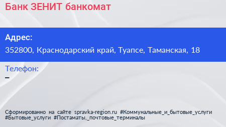 Банк ЗЕНИТ, банкомат по адресу 352800, Краснодарский край, Туапсе, Таманская, 18 в дальнейшем Организация, размещена в следующих категориях: