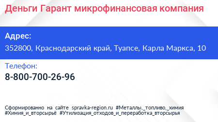 Деньги Гарант, микрофинансовая компания по адресу 352800, Краснодарский край, Туапсе, Карла Маркса, 10 в дальнейшем Организация, размещена в следующих категориях: