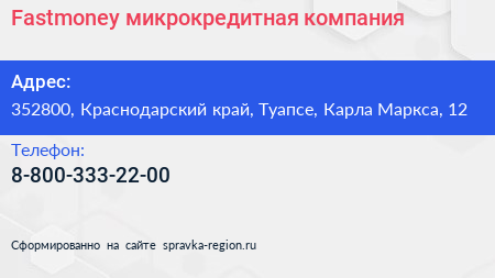 Fastmoney, микрокредитная компания по адресу 352800, Краснодарский край, Туапсе, Карла Маркса, 12 в дальнейшем Организация, размещена в следующих категориях: