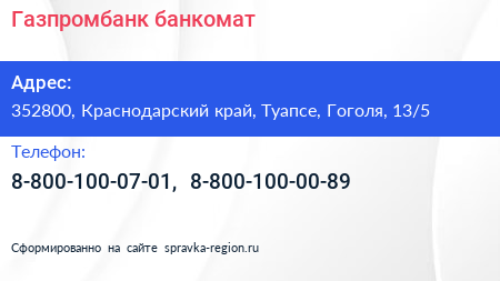 Газпромбанк, банкомат по адресу 352800, Краснодарский край, Туапсе, Гоголя, 13/5 в дальнейшем Организация, размещена в следующих категориях: