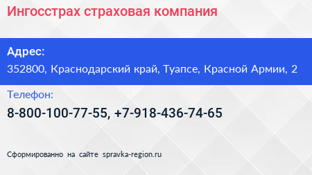 Ингосстрах, страховая компания по адресу 352800, Краснодарский край, Туапсе, Красной Армии, 2 в дальнейшем Организация, размещена в следующих категориях: