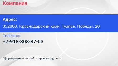 Компания по адресу 352800, Краснодарский край, Туапсе, Победы, 20 в дальнейшем Организация, размещена в следующих категориях: