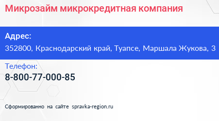 Микрозайм, микрокредитная компания по адресу 352800, Краснодарский край, Туапсе, Маршала Жукова, 3 в дальнейшем Организация, размещена в следующих категориях: