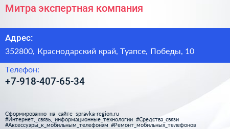 Митра, экспертная компания по адресу 352800, Краснодарский край, Туапсе, Победы, 10 в дальнейшем Организация, размещена в следующих категориях:
