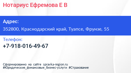Нотариус Ефремова Е.В. по адресу 352800, Краснодарский край, Туапсе, Фрунзе, 55 в дальнейшем Организация, размещена в следующих категориях: