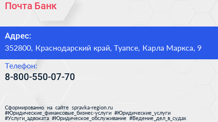 Почта Банк по адресу 352800, Краснодарский край, Туапсе, Карла Маркса, 9 в дальнейшем Организация, размещена в следующих категориях:
