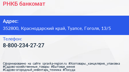 РНКБ, банкомат по адресу 352800, Краснодарский край, Туапсе, Гоголя, 13/5 в дальнейшем Организация, размещена в следующих категориях: