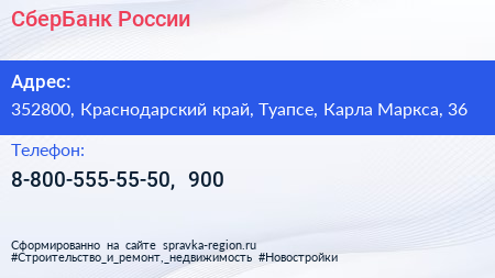 СберБанк России по адресу 352800, Краснодарский край, Туапсе, Карла Маркса, 36 в дальнейшем Организация, размещена в следующих категориях: