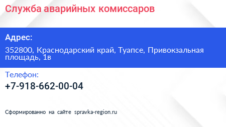 Служба аварийных комиссаров по адресу 352800, Краснодарский край, Туапсе, Привокзальная площадь, 1в в дальнейшем Организация, размещена в следующих категориях:
