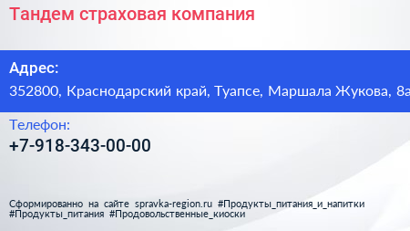 Тандем, страховая компания по адресу 352800, Краснодарский край, Туапсе, Маршала Жукова, 8а в дальнейшем Организация, размещена в следующих категориях: